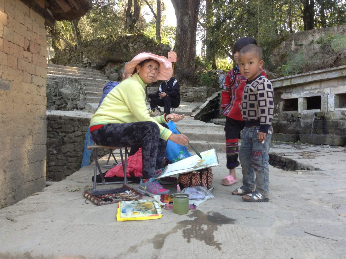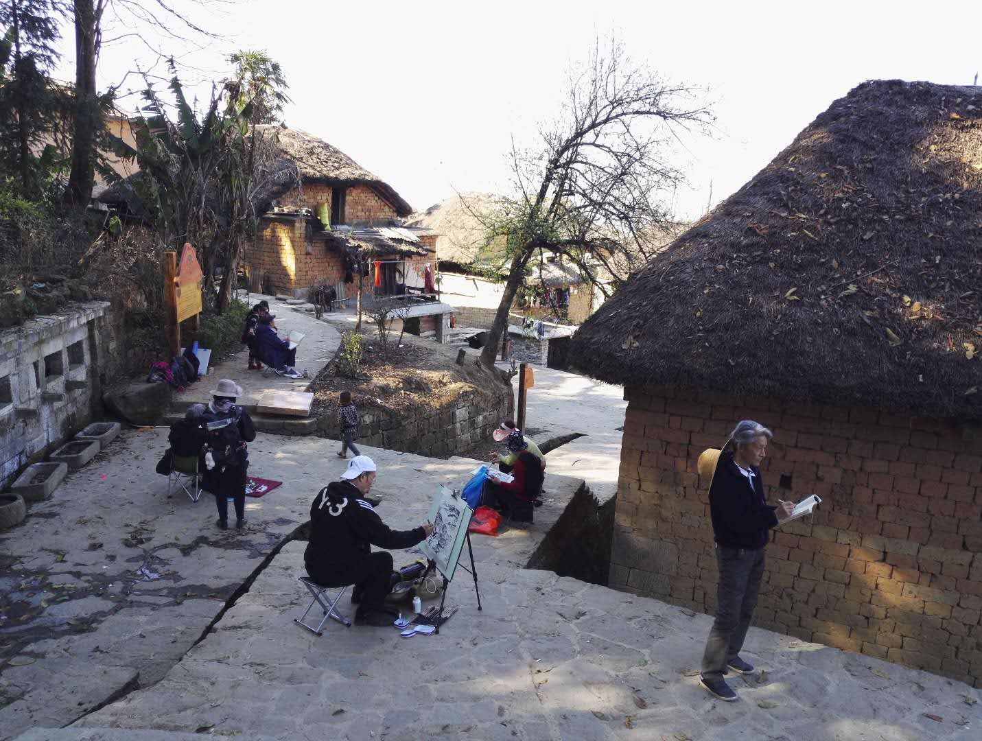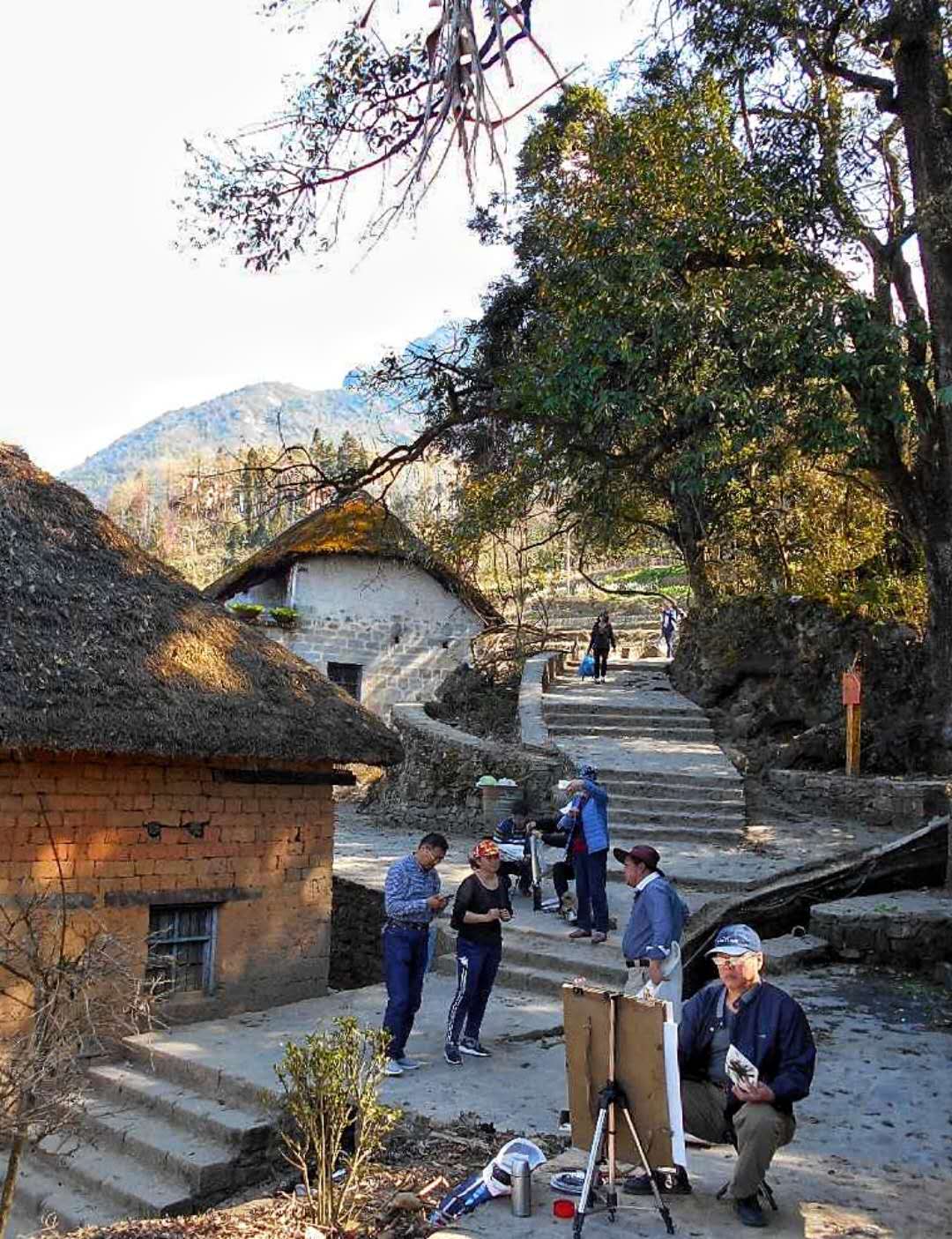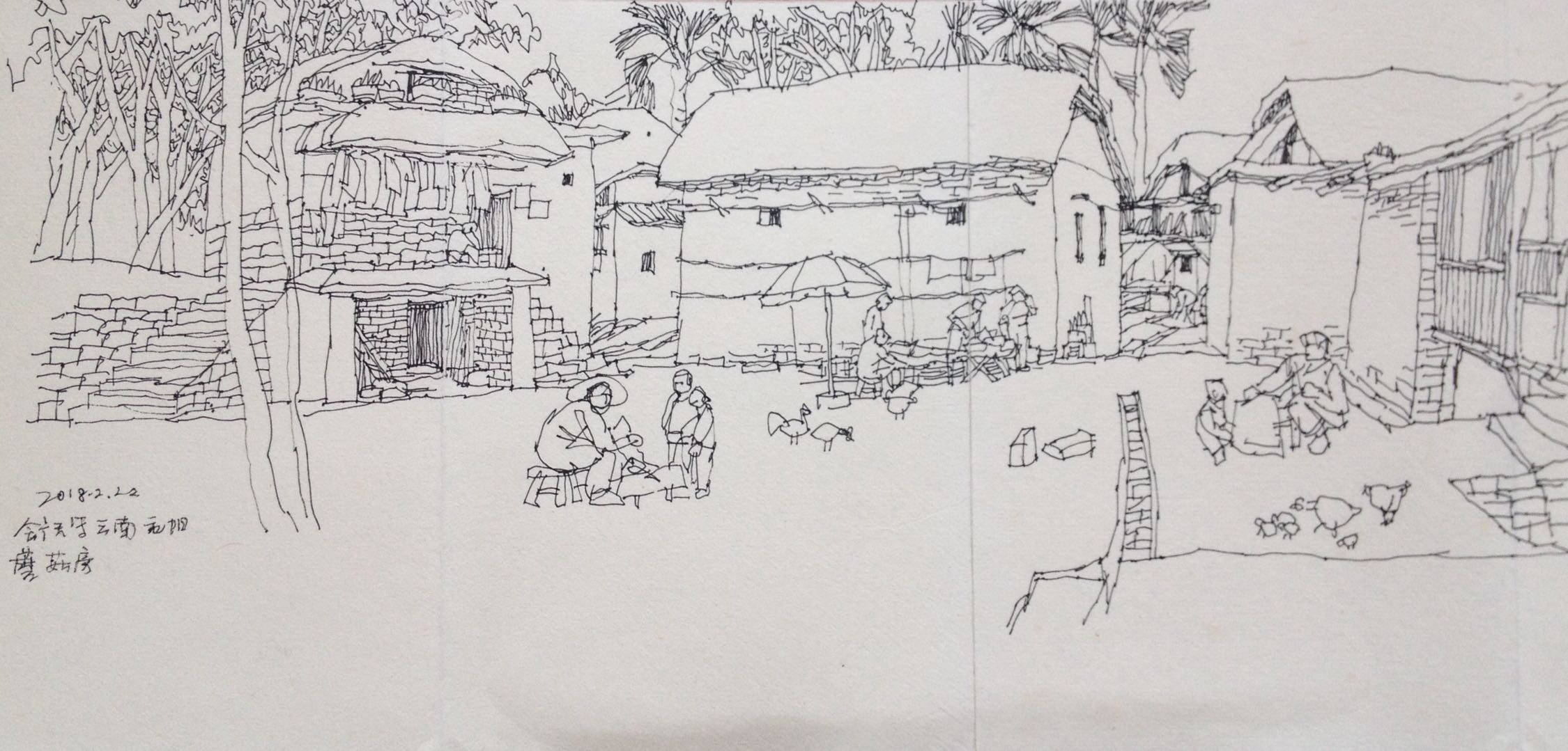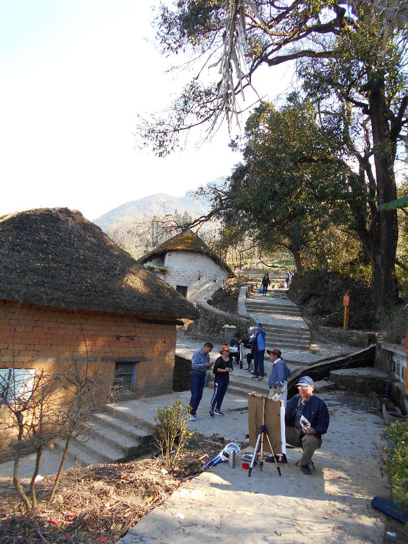 原來準備第二天上午去阿者科村蘑菇房寫生的,由于明天要下雨,時間臨時調整了。決定中午先回賓館吃午飯(按原計劃讓賓館把午飯送到梯田的寫生點),下午兩點出發去蘑菇房寫生,由于旅游旺季交通情況和路況不太熟悉,我們臨時請了當地的導游。盡管已經是下午了,但是路上的車還是非常的多,特別是過多依樹景區車子前行非常艱難,經常停下來等候,但老師們心情還是非常愉快的,還用相機記錄下來沿路的風景。十幾公里的路大巴開了近一個小時,車子停靠在阿者科村進口的大路邊,導游帶著我們沿著小路徒步二十分鐘左右,我們來到村口,當看到芭蕉林、古樹下哈尼族古村落和蘑菇房群時,大家心情有點激動。