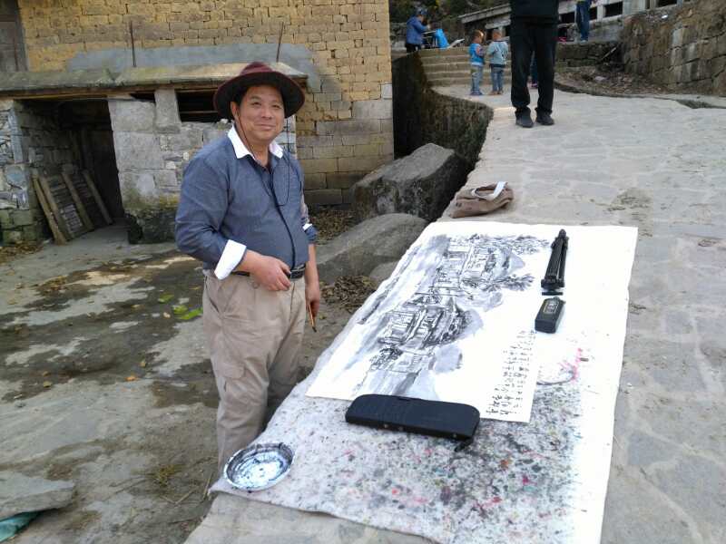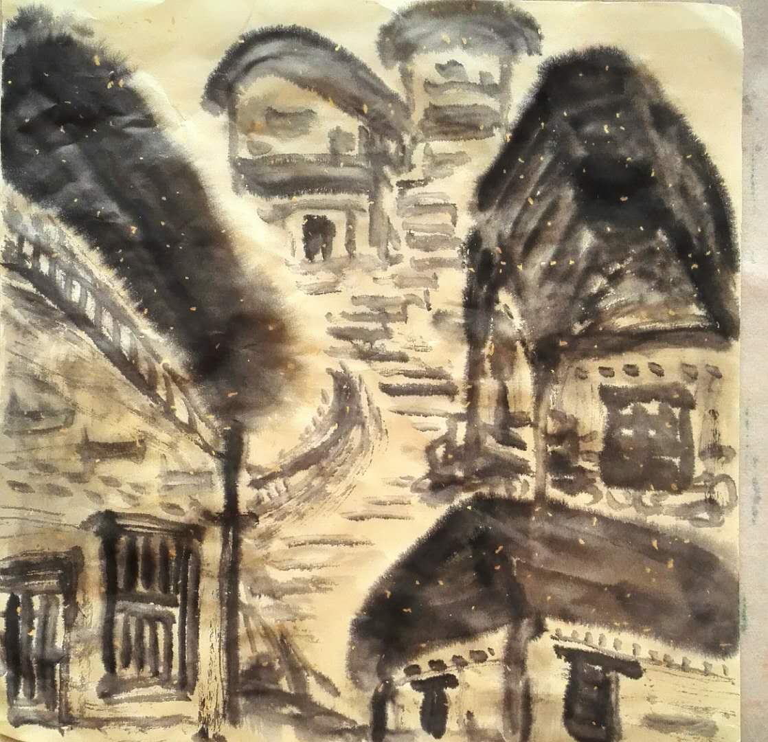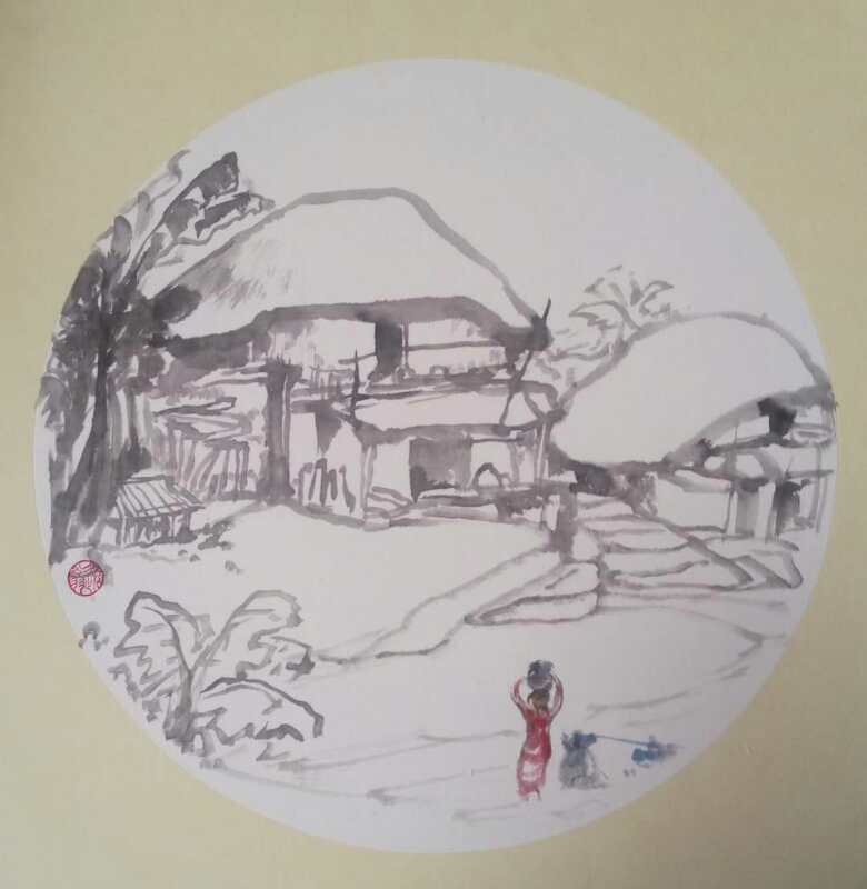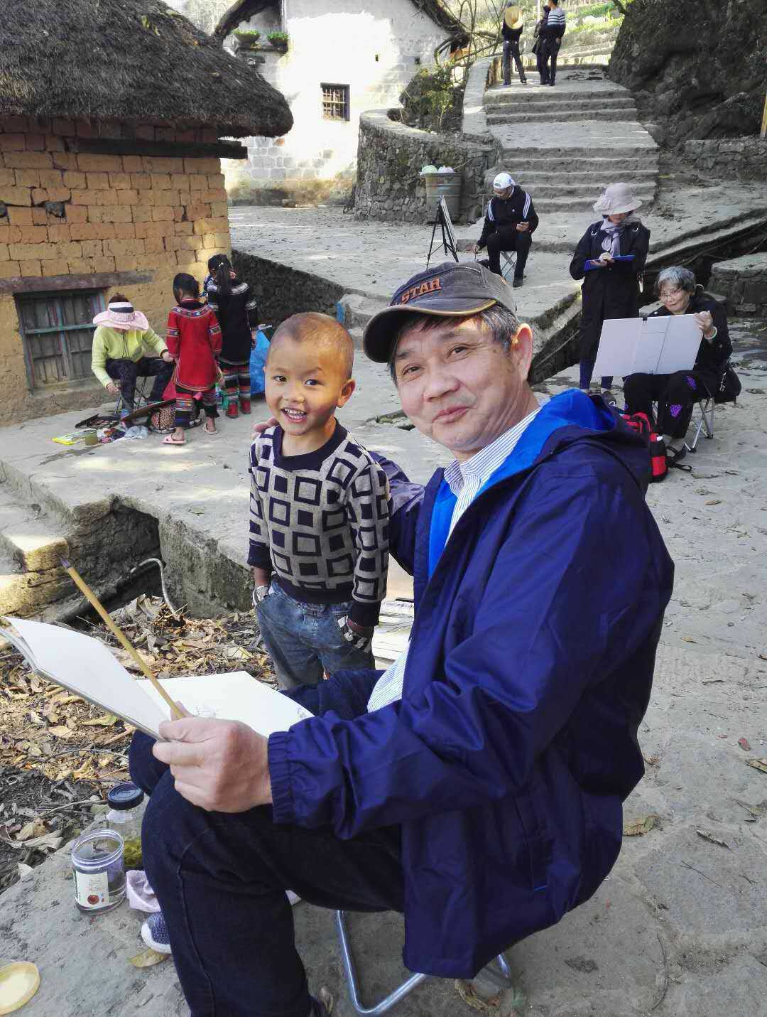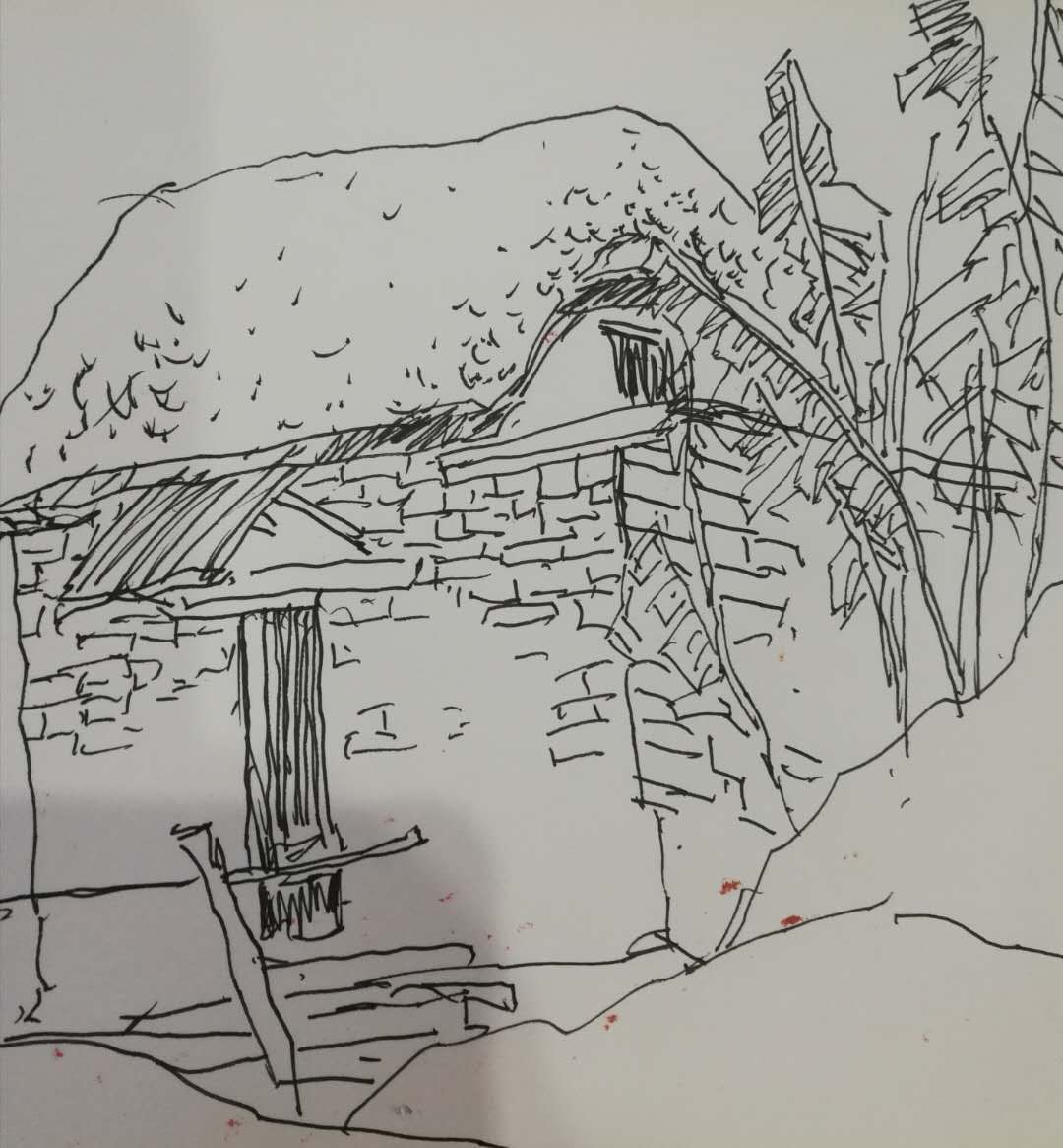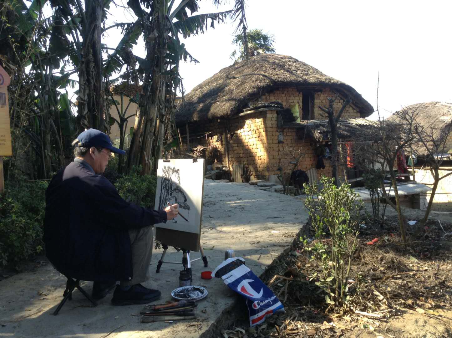 原來準備第二天上午去阿者科村蘑菇房寫生的,由于明天要下雨,時間臨時調整了。決定中午先回賓館吃午飯(按原計劃讓賓館把午飯送到梯田的寫生點),下午兩點出發去蘑菇房寫生,由于旅游旺季交通情況和路況不太熟悉,我們臨時請了當地的導游。盡管已經是下午了,但是路上的車還是非常的多,特別是過多依樹景區車子前行非常艱難,經常停下來等候,但老師們心情還是非常愉快的,還用相機記錄下來沿路的風景。十幾公里的路大巴開了近一個小時,車子停靠在阿者科村進口的大路邊,導游帶著我們沿著小路徒步二十分鐘左右,我們來到村口,當看到芭蕉林、古樹下哈尼族古村落和蘑菇房群時,大家心情有點激動。
