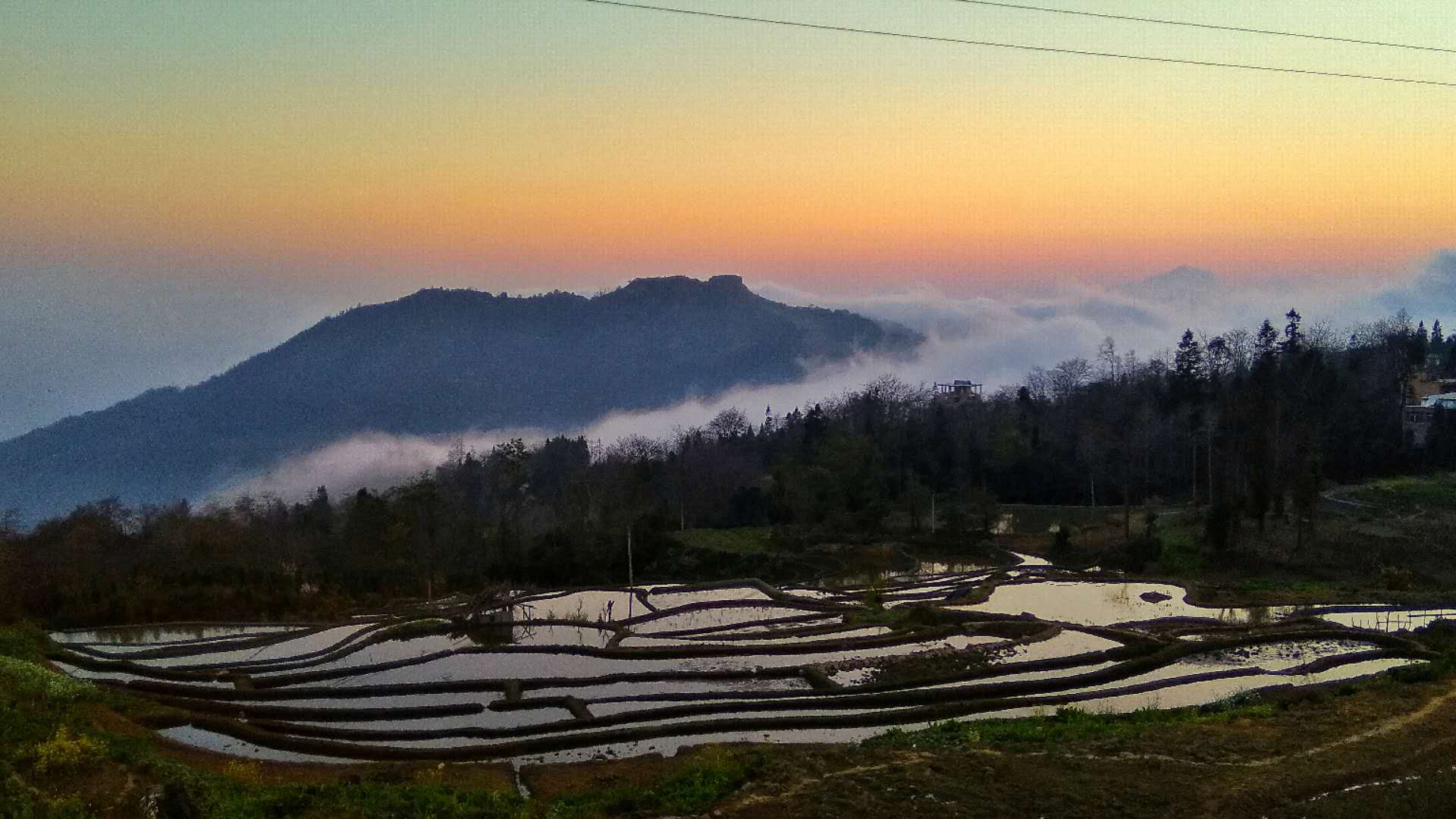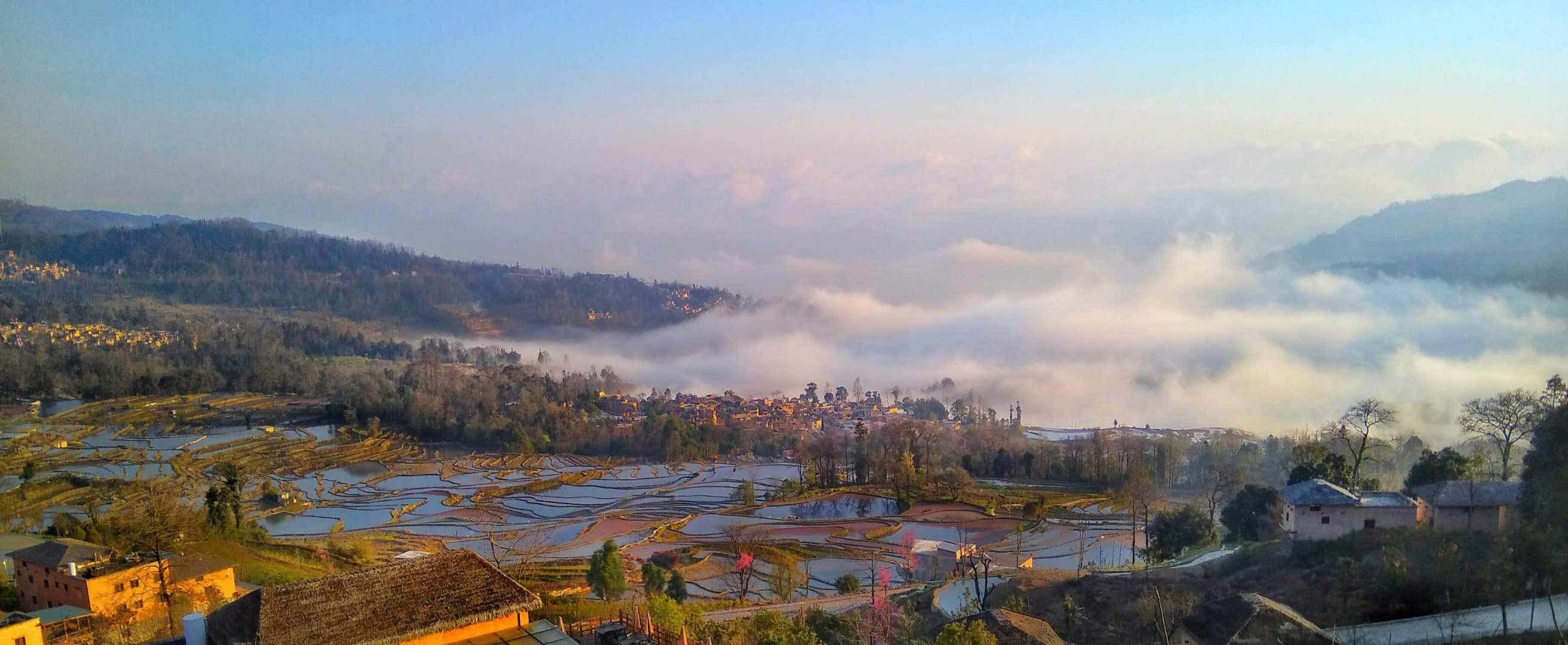 我們采風團一行26人,22號一早八點離開元陽勝村景區(qū),前往寧洱的那柯里茶馬古道的驛站,大概行程要四百公里,一路上梯田的風景非常漂亮,車子行駛在云霧當中,汽車大約開了一個小時,在梯田的一個觀景點停了下來,大家在觀景臺拍了許多照片,還一起合了影。