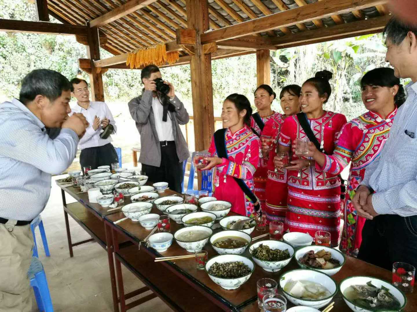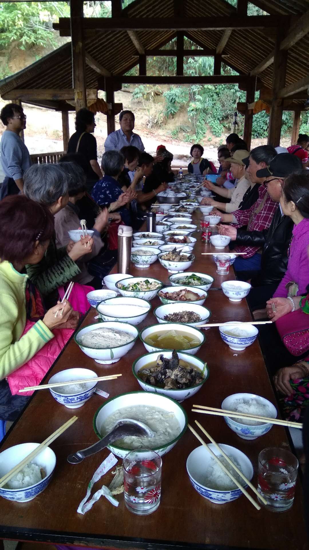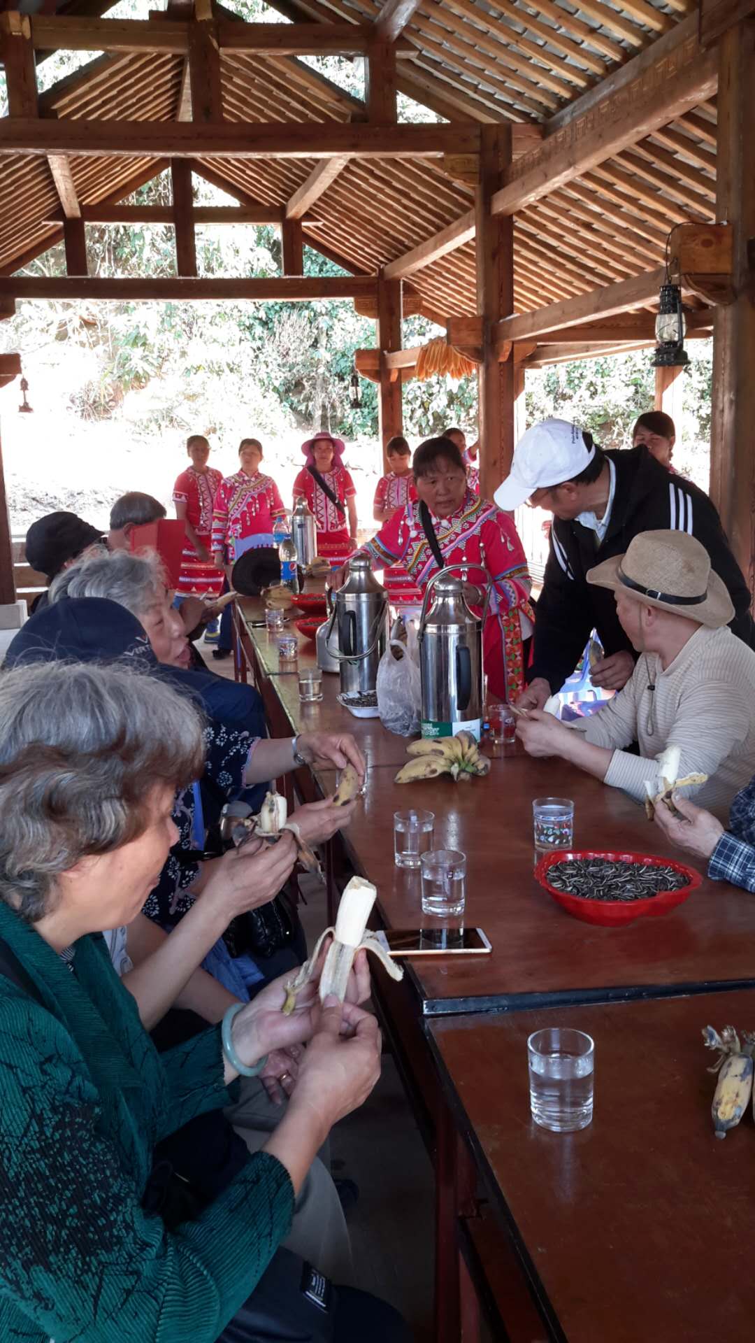 這是一個彝族和拉祜族雜居的村子。李館長在這里建了一棟樓,叫“驛風往事”,這里收藏了許多拉祜族的文物,記載了這個民族的歷史,鎮黨委書記馬德生,鎮長李松濤,紀委書記李軍,村組長是張志華和周老二。對我們到到來表示歡迎,他們告訴我們,我們是路修好以后來的第一批客人,對大歇場村的村民意義重大,因為這條路是村民們做義工修的,路通了,這里就可以發展了,響應習近平主席的號召,脫貧致富,大家一起在長的桌子上喝茶交流,等一下晚飯也在這里吃,大家載歌載舞,和民族同胞一起聯歡。