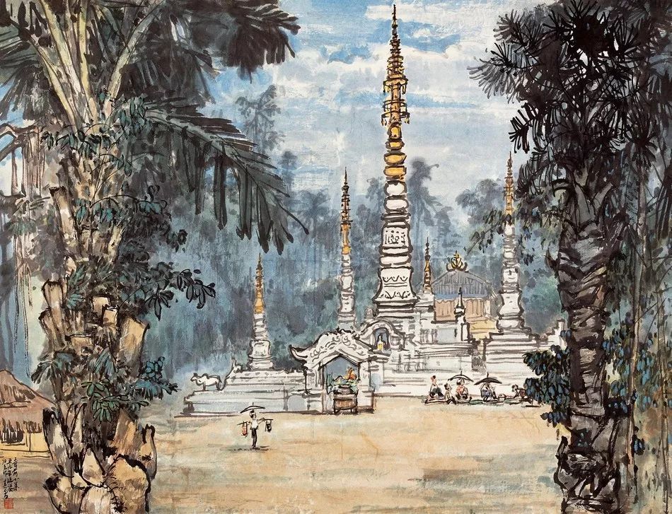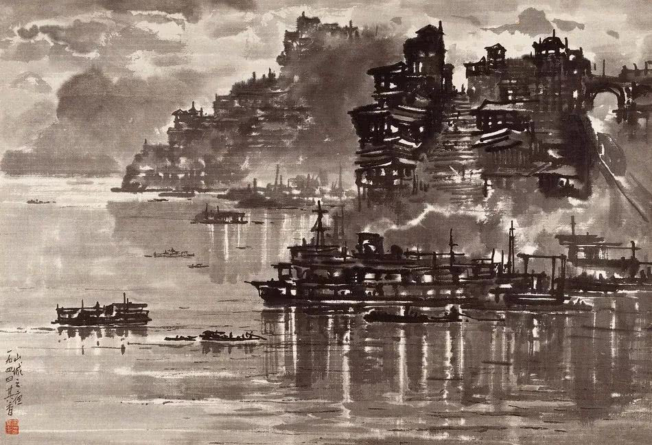 之上這幅作品,山城之夜于1942年在重慶舉辦的“重慶夜景”山水畫展展出,獨(dú)創(chuàng)了中國的夜景山水畫,打破了傳統(tǒng)中國畫不能表現(xiàn)光感的限制,徐悲鴻親自主持了畫展開幕式,并著文說道:“宗其香用貴州土紙,用中國畫筆墨作重慶夜景燈光明滅,樓閣參差,山勢(shì)崎嶇與街頭雜景,皆出以極簡單之筆墨。昔之言筆墨者,多言之無物,今泉君之筆墨管含無數(shù)物象光景,突破古人的表現(xiàn)方法,此為中國畫的一大創(chuàng)舉,應(yīng)大書特書者也!