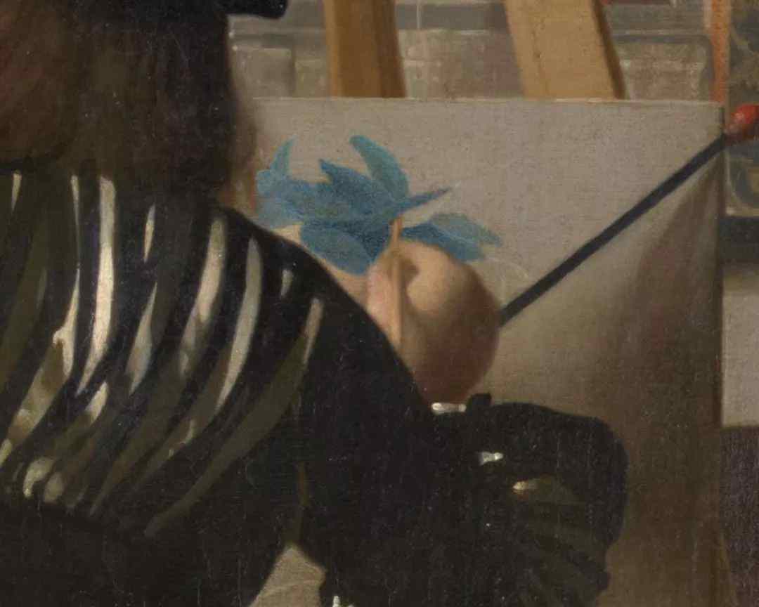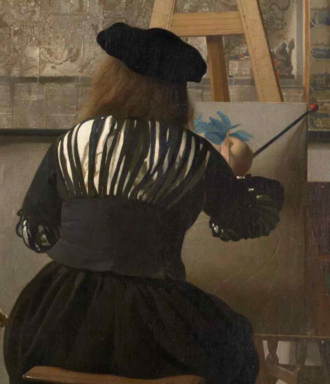 維米爾每一幅作品都有長長的準備期,在這段時間里,各種跡象可以看出來,他在思考如何賦予日常生活場景以象征意義,而且慣于用隱晦手法達到目的,比如背景中的畫,或是用某些難以發現的細節。但在《繪畫的藝術》中,主題本身就是對繪畫的象征。模特代表名聲,她的形象將要在展現在藝術家畫架上的畫布中。藝術家已經開始畫模特頭上的月桂頭冠。