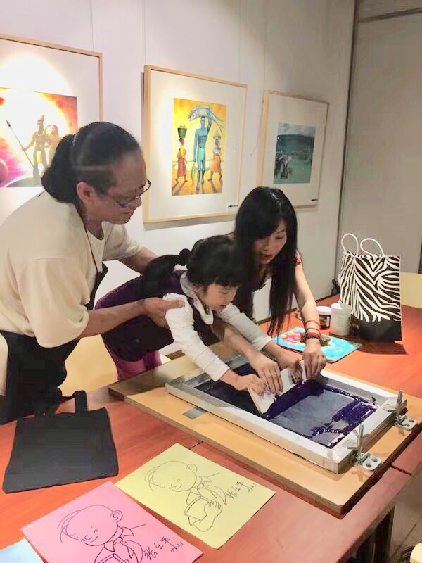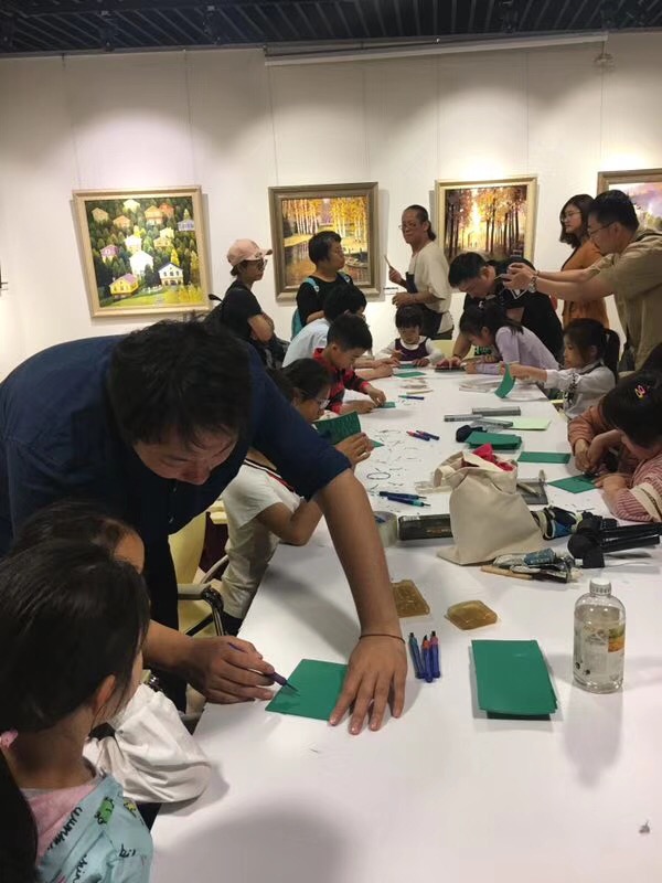 畫展現(xiàn)場與愛好美術(shù)的小朋友們,做版畫創(chuàng)作的互動