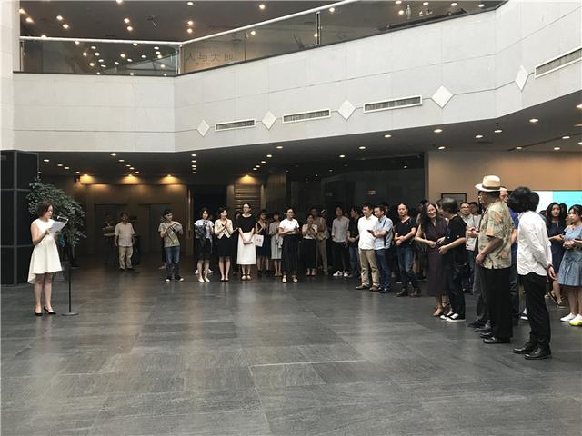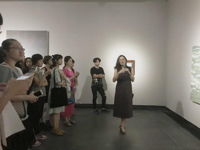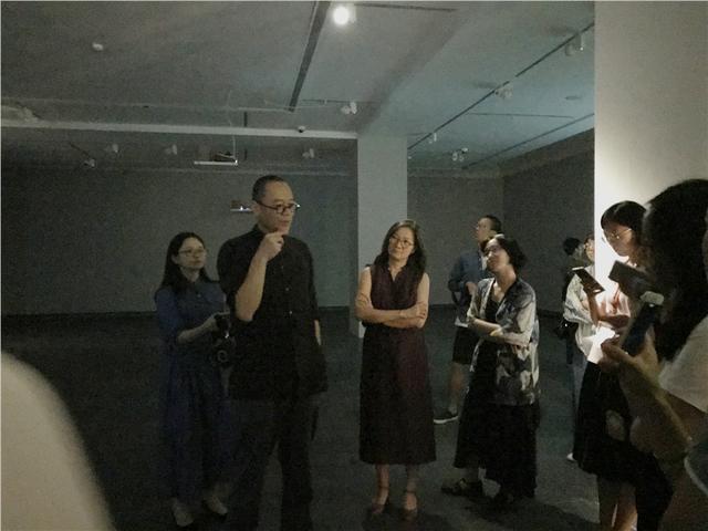 策展人樊林導覽1號展廳,與本次展覽藝術家倪軍(右一)一起介紹作品