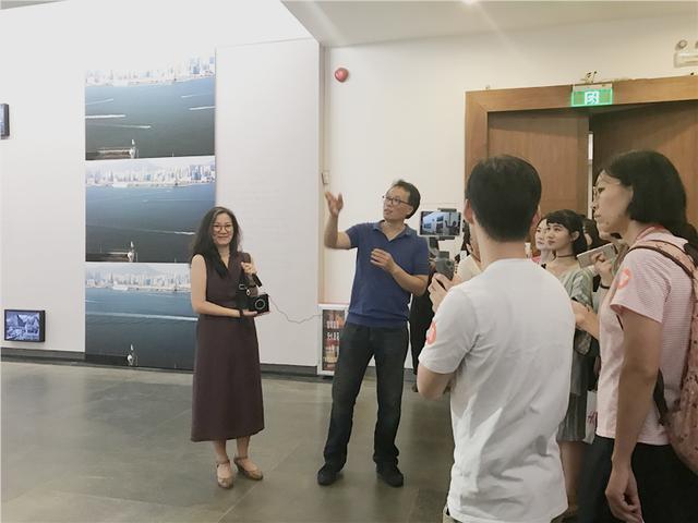 策展人樊林導覽2號展廳,與本次展覽藝術家胡介鳴(左二)一起介紹作品