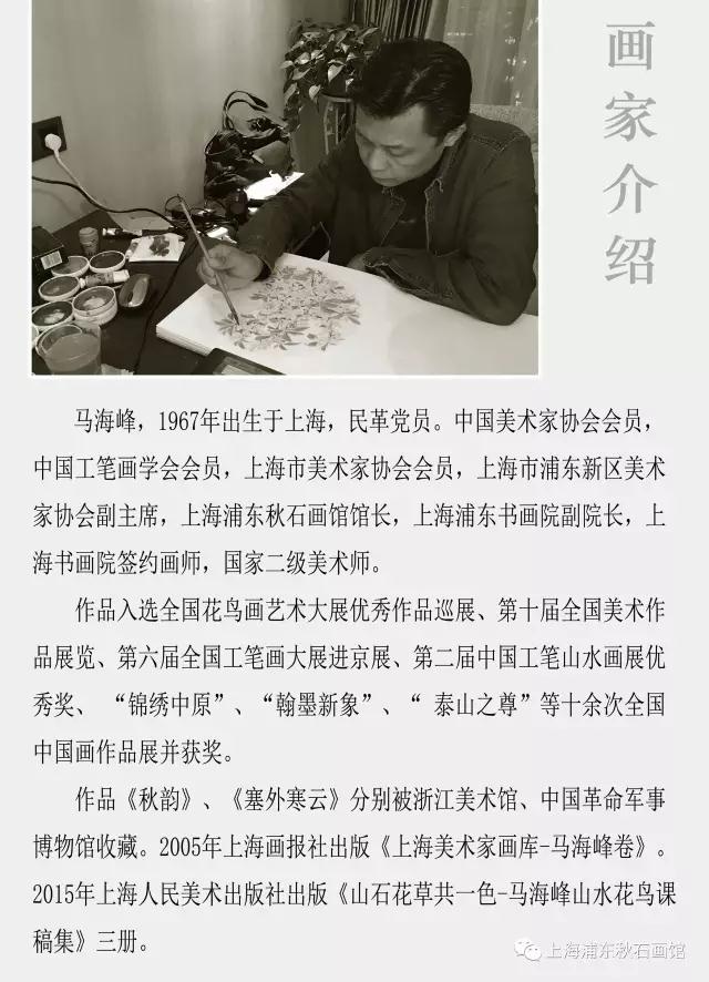 上海浦東秋石畫館由馬海峰館長親自執(zhí)教。馬海峰現(xiàn)為中國美術家協(xié)會會員,上海浦東新區(qū)美術家協(xié)會副主席。他表示,作為一名土生土長的藝術家,能將自己所掌握到的國畫技巧無償?shù)钠占敖o本土國畫愛好者將是一種長期的社會責任,并通過上海浦東秋石畫館的網(wǎng)站和微信公眾平臺在每次課后發(fā)布授課視頻,讓更多的大眾了解中國畫,喜愛傳統(tǒng)藝術,這正是馬海峰創(chuàng)建畫館的理念。