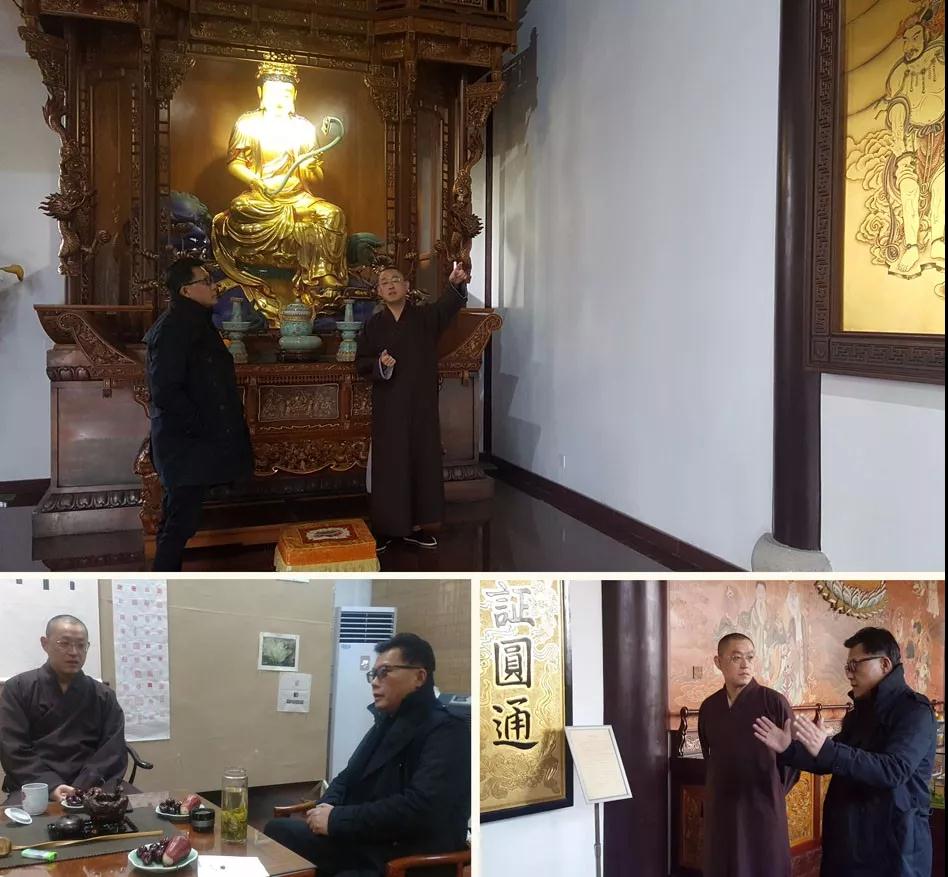 2018戊戌新年即將來臨,從2月12日開始,到嘉善龍莊講寺來旅游觀光、請香祈福的人們,一定會發(fā)現(xiàn),寺廟內(nèi)大雄寶殿文殊、普賢菩薩兩壁增加了兩幅高4米、寬1.5米的大型主題創(chuàng)作:創(chuàng)作以五臺和峨眉兩座佛教名山為內(nèi)容,一幅是“五臺春夏金色界”,一幅是“峨眉秋冬銀色界”,作品給人的第一感覺就是氣勢雄強,巨峰壁立,山頭或白雪皚皚或林樹茂密,山腳下則小橋清溪,使全幅作品體勢錯綜,畫面飽滿,在山勢中隱現(xiàn)的白色古塔和峨眉金頂,使觀者如聞佛法的呼吸和文化的脈動,也點出了兩幅畫的主題。最妙的是整幅畫既氣勢不凡,每個局部和構(gòu)圖卻又極為精致,凡山川、流水、高山、巖石,都能細心勾畫且呈現(xiàn)出立體的自然空間,極具質(zhì)感,造成一種撼人心魄的視覺效果。