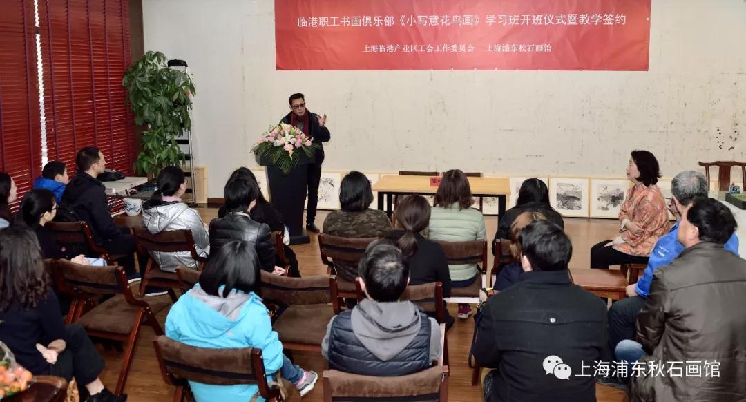 2018年3月10日下午,由上海臨港產(chǎn)業(yè)區(qū)工會工作委員會主辦、上海浦東秋石畫館承辦的臨港職工書畫俱樂部“小寫意花鳥畫”培訓班開班儀式在上海浦東秋石畫館舉行。各園區(qū)企業(yè)20多名國畫藝術愛好者參加了開班儀式。