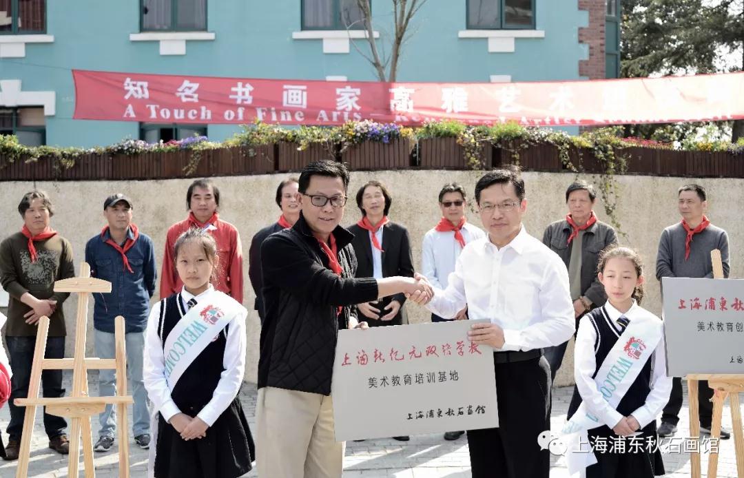 上海新紀元雙語學校校長李海林教授與上海秋石畫館館長馬海峰先生舉行了揭牌儀式,正式宣布上海新紀元雙語學校與上海秋石畫館建立了校外藝術教育基地。相信在不遠的將來,NEBS孩子們的藝術素養(yǎng),一定會更上一個臺階。為了將學生培養(yǎng)成為具有國際視野、民族精神、健康體魄和藝術情懷的少年英雄和青年才俊,學校同上海大劇院、上海音樂廳等都建立校外藝術教育基地的關系。從小在書香墨韻中熏陶的孩子們聽說有知名書畫家來校,都興奮極了,給藝術家們戴紅領巾,更是積極地充當起了小導游,帶著眾多知名藝術家們逛起了校園。