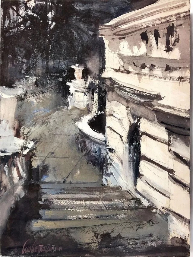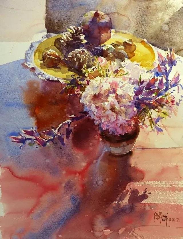 水彩,顧名思義,是水與色彩的邂逅、調(diào)和、交感。在水和顏料的作用下,物象怎樣在層次、體塊、光感等方面得到恰如其分的表達(dá),既是對每個畫家用水技巧的考驗,也是對創(chuàng)作主體在對客體進(jìn)行主觀取舍、加工、變形、熔合時更高自由度的允諾。
