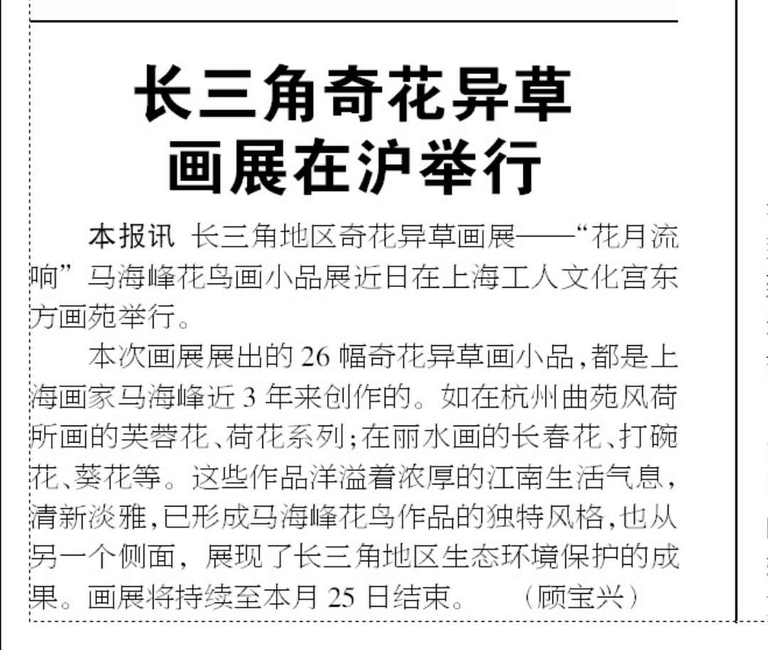 作品《秋韻》、《塞外寒云》分別被浙江美術館、中國革命軍事博物館收藏。2005年上海畫報社出版《上海美術家畫庫-馬海峰卷》。2015年上海人民美術出版社出版《山石花草共一色-馬海峰山水花鳥課稿集》三冊。