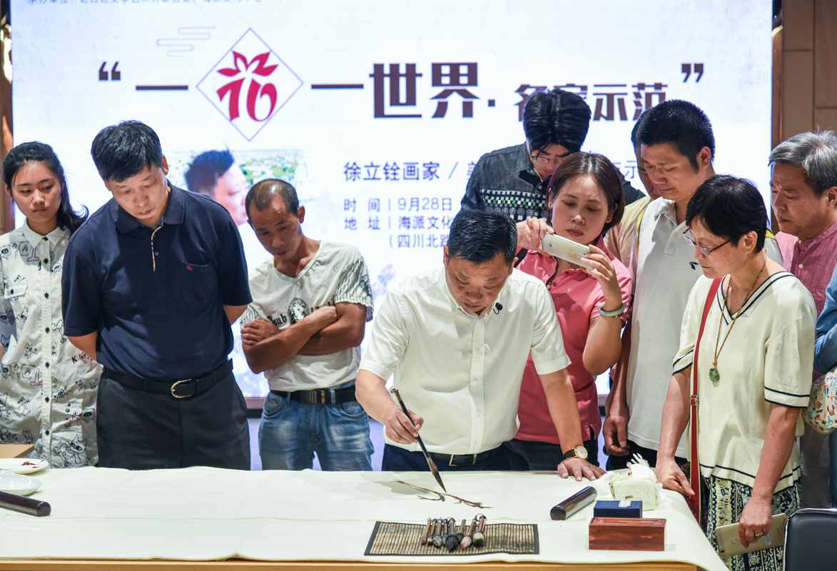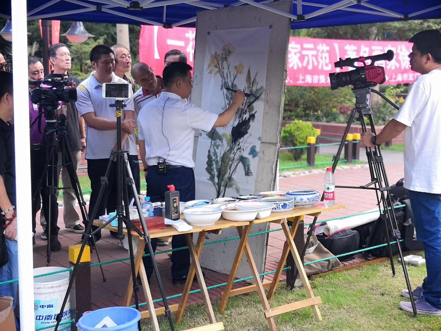 在上海市文學藝術界聯合會指導,上海市文聯媒體中心聯合上海市美術家協會共同推出“一花一世界·名家示范”活動,第六期有著名畫家徐立銓美人蕉寫生示范活動與2018.9.28.上午九點在上海海派文化中心舉行,這次活動有虹口區文聯和上海海派文化中心承辦,上午八點半已經有許多藝術愛好者早早地來到海派文化中心廣場寫生現場,電視直播的工作人員也早早地來到現場調試攝像機。