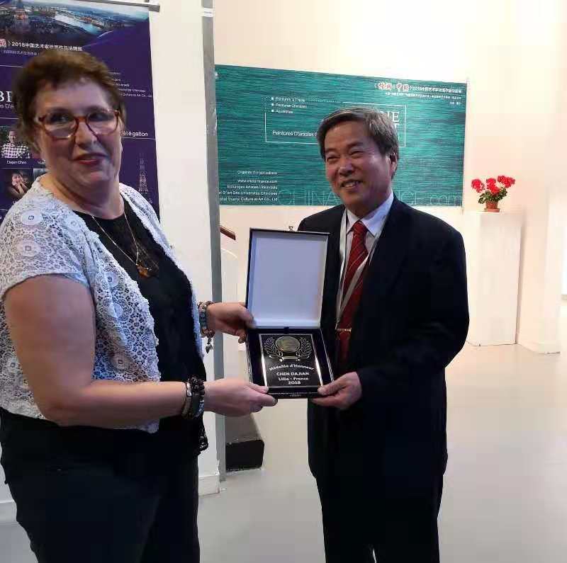 10月23日下午6點,大健作為中國9位杰出藝術家應邀赴法出席了在法國里爾北加萊公立高等美術學院舉行的“燦爛.中國”2018中國藝術家繪畫作品法國展開幕式”并被頒發了2018年“法蘭西共和國榮譽勛章”和“榮譽證書”。