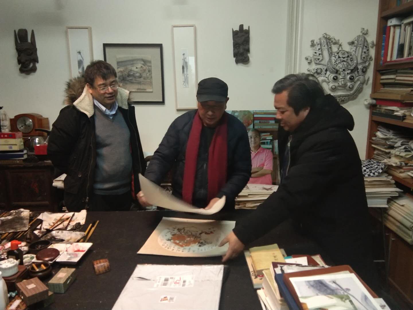 二月十四日下午,我和黃阿忠老師約好下午三點半去阿忠老師的畫室,阿忠老師家已經高朋滿座,到老師畫室最開心的事,就是看老師的繪畫作品,老師的油畫和國畫樣樣精通,散文和詩賦可以說是上海灘的全才,我來到畫室自然就談到繪畫,他分析了我最近一段時間的寫生和創作的作品,又毫不保留的示范和解說,讓在場的人得益匪淺。