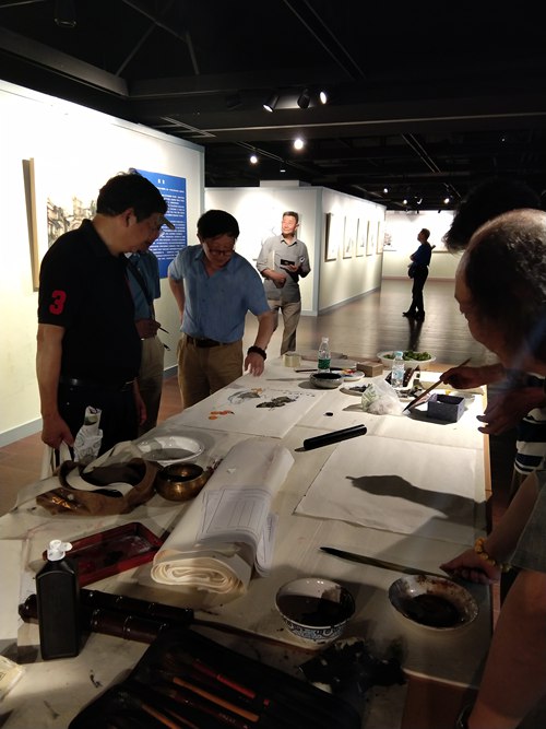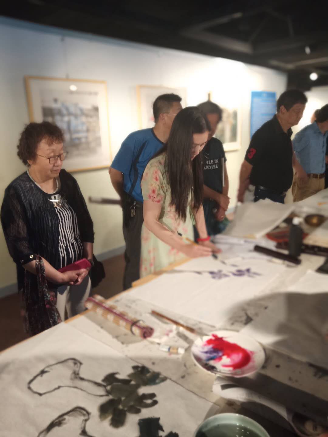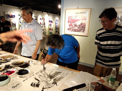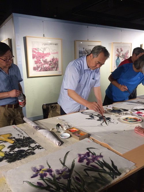 于六月六日下午兩點鐘在海派文化中心開幕,這次畫展 由青村鎮人民政府和上海美協花鳥畫藝術沙龍主辦,海派文化中心承辦,這次畫展不搞開幕式,參展畫家和美術愛好者歡聚一堂,揮毫潑墨,藝術交流,藝術氛圍濃濃。由于沒有開幕式,大家來來往往,拍了許多合影。