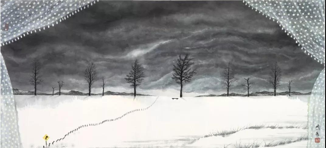 《桃源尋夢-舞臺雪景-C001》 手工宣紙、中國墨 60 x 132cm 2015年
