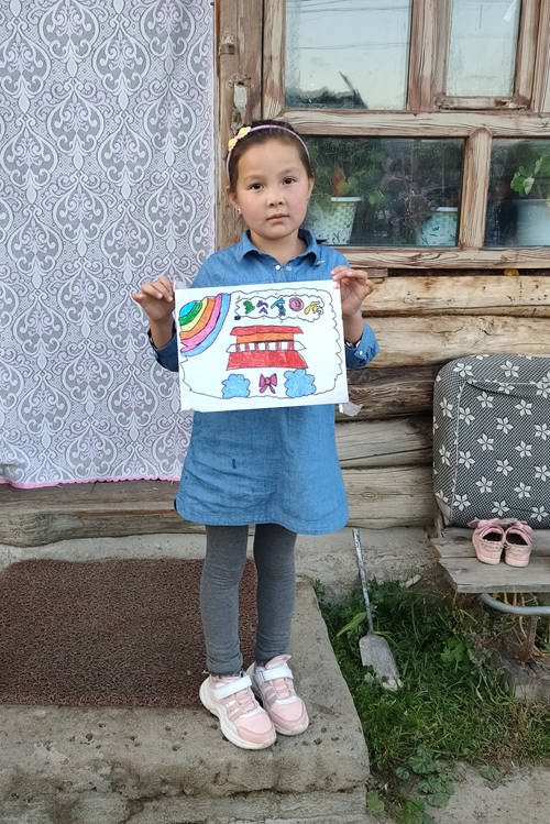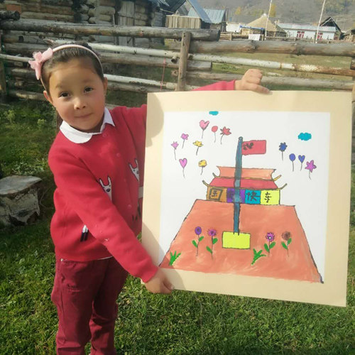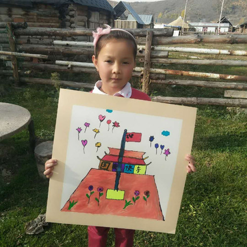 我和哈拉哈提的媽媽瑪利亞互相加了微信,我準備長期關(guān)注女孩,瑪利亞回到家里以后給我發(fā)了一幅她女兒畫的天安門作品,我一看作品立意很好,畫的也很好,我就把作品轉(zhuǎn)發(fā)給上海國旗展組委會負責人童科館長,童科很重視,我介紹說:小女孩從小生活在新疆最西北的村莊,是哈薩克族,今年才六歲,父母是牧民,畫的作品有特色。童科覺得有故事,讓我馬上到她家里去錄視頻,拍照,國旗展組委會準備聯(lián)合上海人民廣播電臺要做一檔一個小女孩的故事,我和大陸馬上聯(lián)系瑪利亞,到瑪利亞家,哈拉哈提的老師也來了,她叫加依娜,來幫忙做翻譯。由于已經(jīng)是晚上七點半了,這些工作我們要抓緊完成,因為我們回到鐵熱克提鄉(xiāng)政府招待所路上要一個多小時路程。