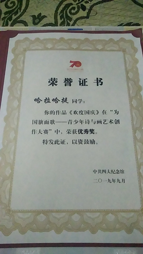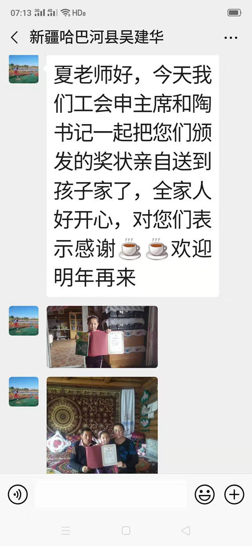 上海海派文化中心國旗展組委會,為哈拉哈提頒發(fā)了優(yōu)秀獎和獎品,工作人員把獎狀獎品寄到哈巴河縣總工會,吳建華書記和縣有關(guān)領(lǐng)導于11月9日開車幾個小時親自把獎狀和獎品送的哈拉哈提家,代表上海國旗展組委會和哈巴河縣領(lǐng)導對小女孩的關(guān)心和慰問,并把獎狀和獎品送到小女孩哈拉哈提手里。