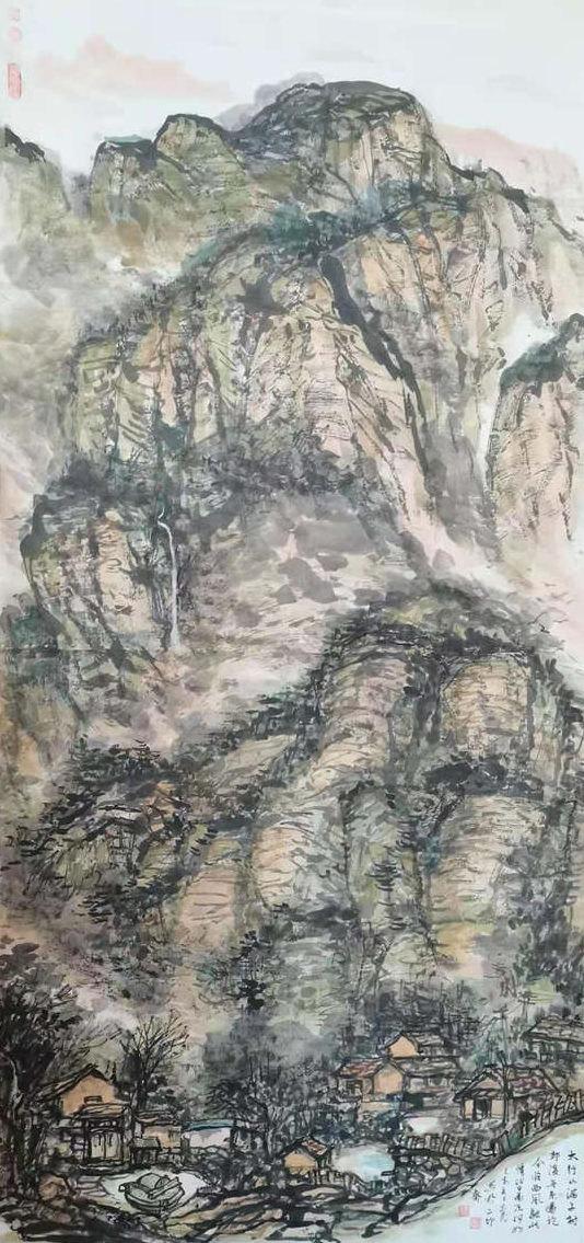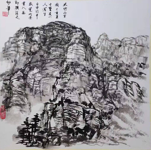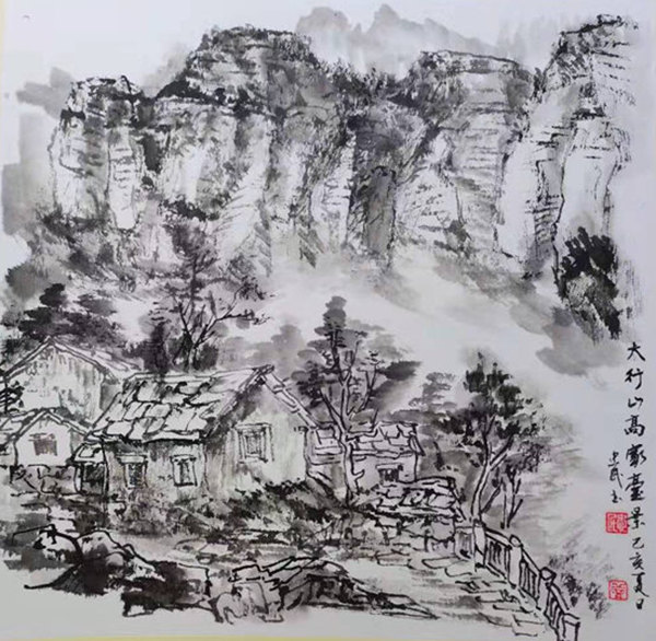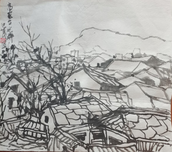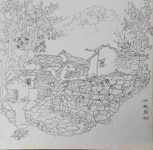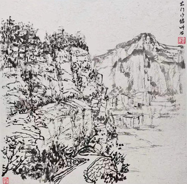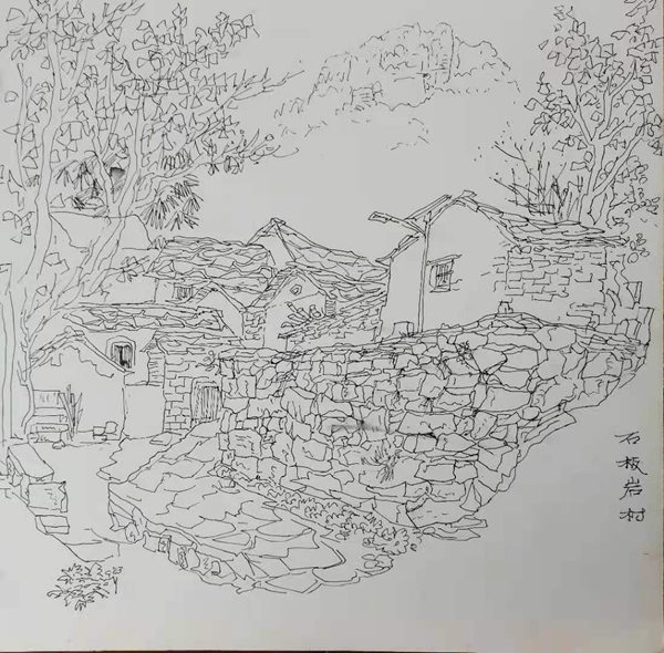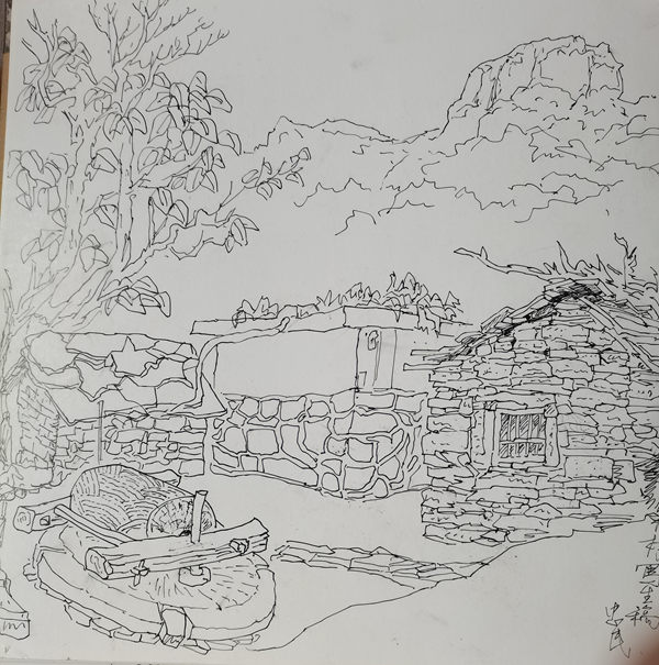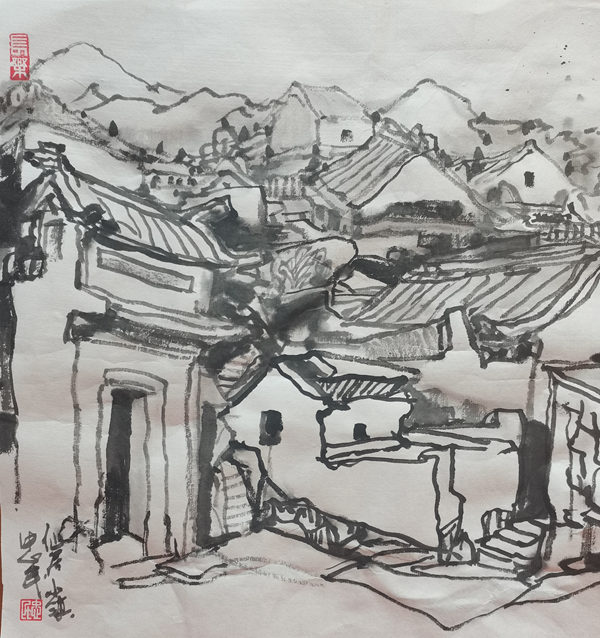 再說行路。如今的飛機、高鐵、汽車給人們帶來了快速的便捷,空間距離不再是問題。于是,只要有時間,孫忠民常會約上三五知己,背上畫夾,結伴而行。他更樂于隨由市美協沙龍、海墨畫院等組織的寫生采風團,先后在云南昆明、貴州烏江、河北太行山、浙江仙居等地尋尋覓覓。漫長的旅程,觸目的美景,化成了一幅幅水墨淋漓的小品,或線條簡潔的鋼筆速寫,這些點點滴滴的記錄,是他的所思所想,也是他的追求。