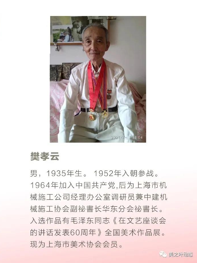 “畫友薈”創作沙龍此次參展藝術家共有22名。其中,有57年黨齡的志愿軍老戰士、有區黨代表、有參與設計重要時段人民幣及國家票證的設計家、有檔案館干部、有大學中專美術老師、專業畫刊美術編輯、區美協負責人、外企國企CEO等。參展者中,年齡最大的86歲,成員中百分之七十是中國美術家協會或上海市美術家協會會員。參展作品有中國畫、油畫、版畫、水彩畫、鋼筆畫等,畫面主題突出、立意新穎、形式多樣、特色鮮明,展覽是天山社區文化活動中心“畫友薈”創作沙龍的一次可貴的藝術呈現與交流。參展作品風格各異,題材涉及面廣,有中國共產黨一大會址紀念館等紅色革命教育基地,也有反映上海過去和現在變遷的風景風情,還有表現青山綠水、鳥語花香的祖國風貌。藝術家們揮毫潑墨、暢抒胸臆,贊頌中國共產黨革命歷程和現代化建設的偉大成就,熱情謳歌中國共產黨的英明領導,表達藝術家對偉大祖國和人民的深情熱愛。
