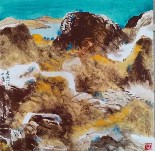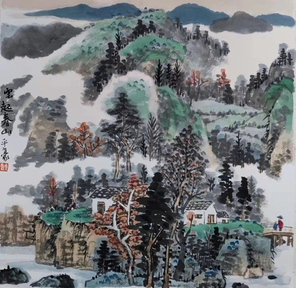 平豪的這幅畫畫的是春山,山岫重巒,依偎生姿,青綠如秀,一派春光明媚。但是,平豪不忘當代畫家,在當代為何畫山水的價值,也就是我們講的山水畫在當代存在的價值。