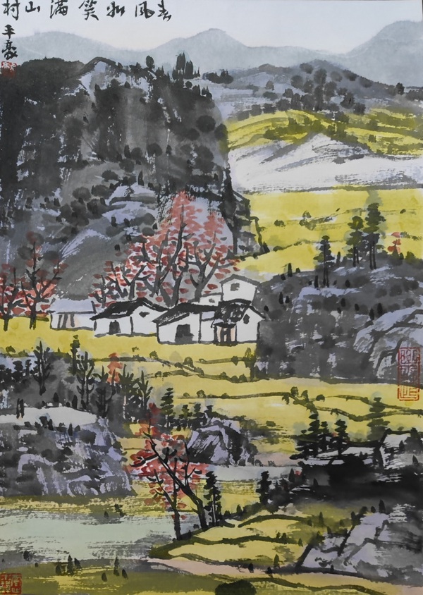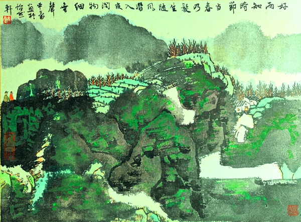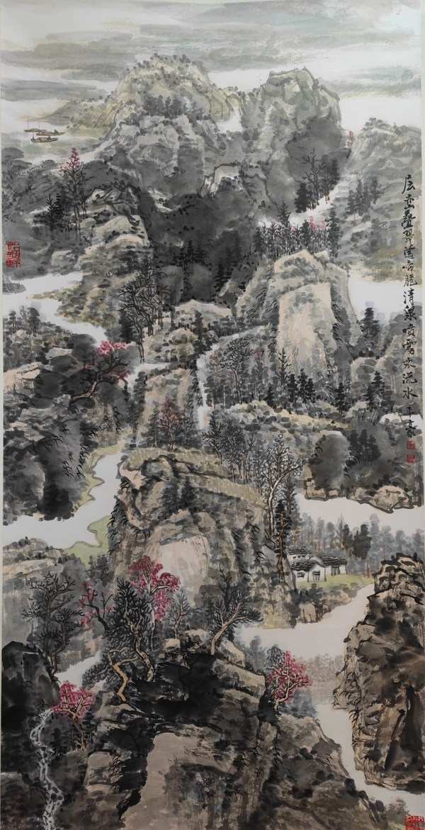 這幾年,上海中國畫壇進入中年的國畫家大多很沉穩,山水畫在他們看來更重筆墨的涵養。從這幅畫中我們可以看出平豪將王蒙與龔賢的山水畫融合,這本是用筆姿在做春山的大文章,又以小青綠襯托其神,這樣一幅春景就顯出春光無限的魅力。真如藝術大理論家所講的,現當代的山水就是散文的筆調描活富春山居圖,上溯古風,下擁生活氣息,平豪領會其神。所以,這幾年,平豪的山水畫創作有著顯著的進步,我想這也是平豪將深情的筆墨升華到修養的原因。