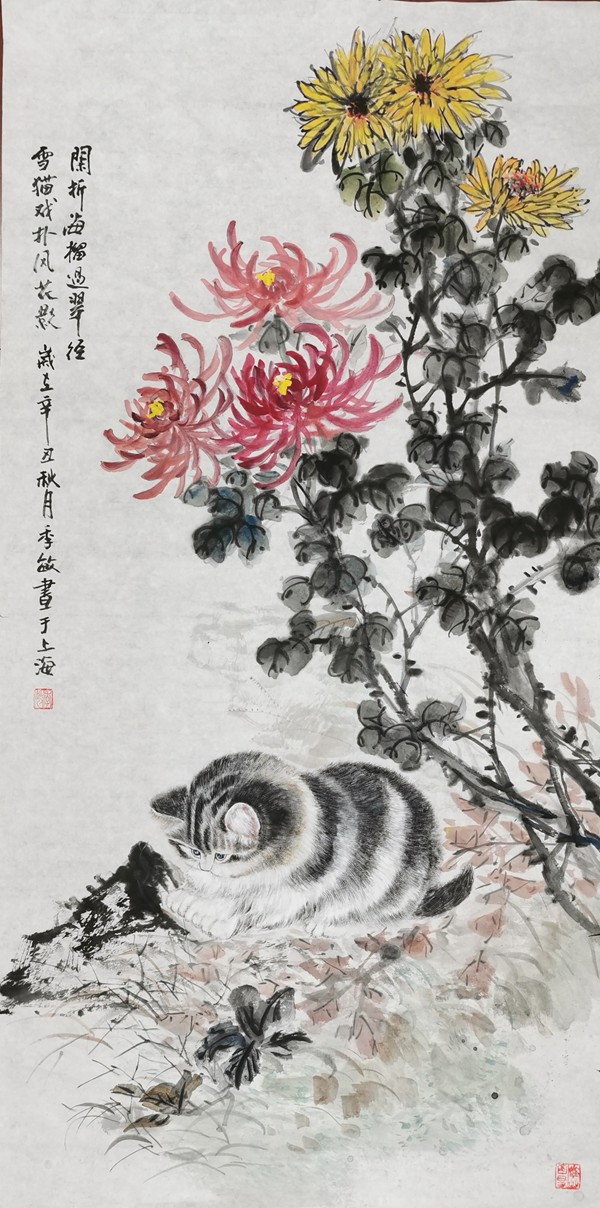 2021年深秋,她參加了一個集上海國畫大家的群展《辛丑回眸》,我特地到魯迅公園旁的朱屺瞻美術館參加開幕活動,在季敏的畫前,嘉賓觀看她的畫作滯留時間是最長的。她參展的是兩幅大尺幅的工筆貓。很多國畫家、主辦人尊稱她“季總”。季敏已經成長為單位里的中層領導了。